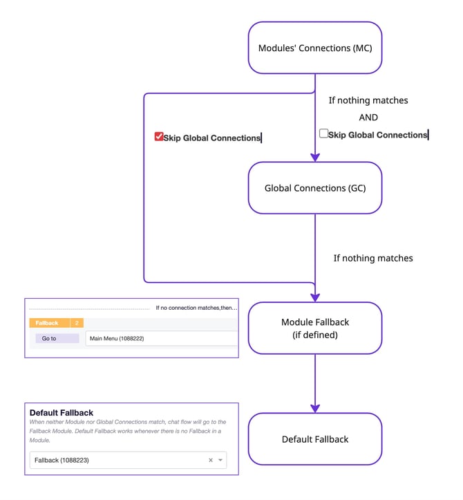 - Global connections – defined at the bot level (Bot Settings). They catch universal intents or conditions and provide cross‑module behavior.